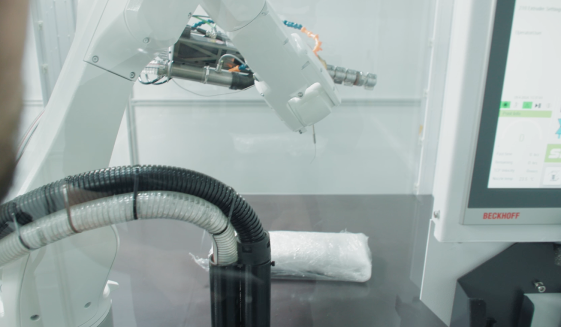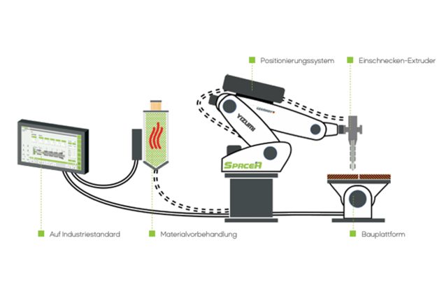 Additive Fertigung, wirtschaftlich umgesetzt: SpaceA nutzt einen Schneckenextruder für Standard-Granulate, ein 6-Achs-Positioniersystem, hohe Modularität und eine Industriestandard-Steuerung